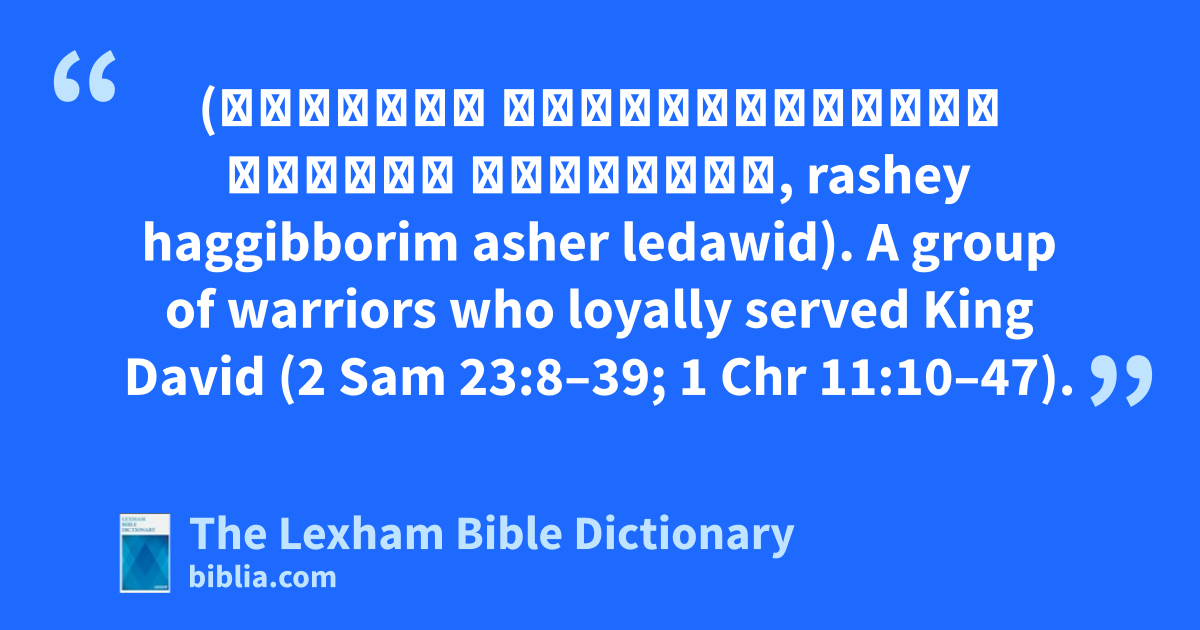 David’s Champions (רָאשֵׁי הַגִּבּוֹרִים אֲשֶׁר לְדָוִיד, rashey haggibborim asher ledawid). A group of warriors who loyally served King David (2 Sam 23:8–39; 1 Chr 11:10–47).