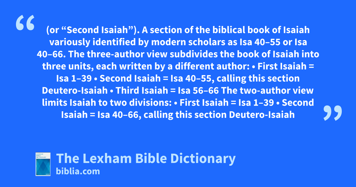 Deutero-Isaiah (or “Second Isaiah”). A section of the biblical book of Isaiah variously identified by modern scholars as Isa 40–55 or Isa 40–66.