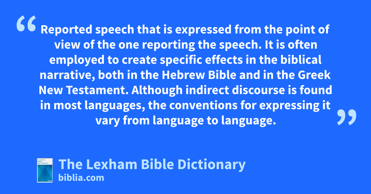 Discourse, Indirect Reported speech that is expressed from the point of view of the one reporting the speech. It is often employed to create specific effects in the biblical narrative, both in the Hebrew Bible and in the Greek New Testament. Although indirect discourse is found in most languages, the conventions for expressing it vary from language to language.