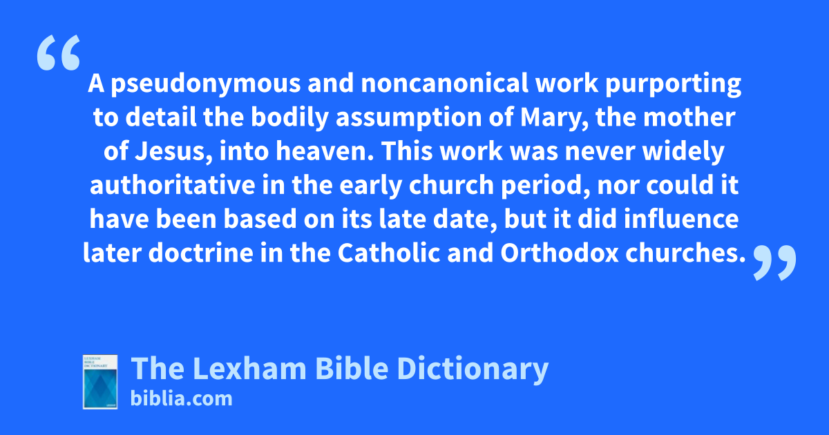 Discourse of John the Divine A pseudonymous and noncanonical work purporting to detail the bodily assumption of Mary, the mother of Jesus, into heaven. This work was never widely authoritative in the early church period, nor could it have been based on its late date, but it did influence later doctrine in the Catholic and Orthodox churches.