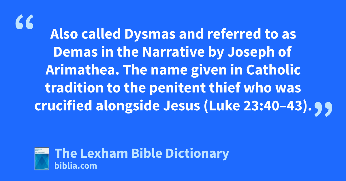 Dismas Also called Dysmas and referred to as Demas in the Narrative by Joseph of Arimathea. The name given in Catholic tradition to the penitent thief who was crucified alongside Jesus (Luke 23:40–43).