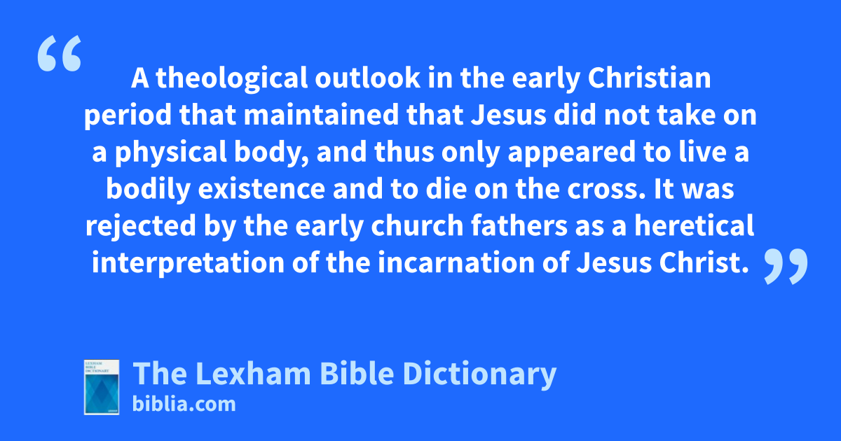 Docetism A theological outlook in the early Christian period that maintained that Jesus did not take on a physical body, and thus only appeared to live a bodily existence and to die on the cross. It was rejected by the early church fathers as a heretical interpretation of the incarnation of Jesus Christ.