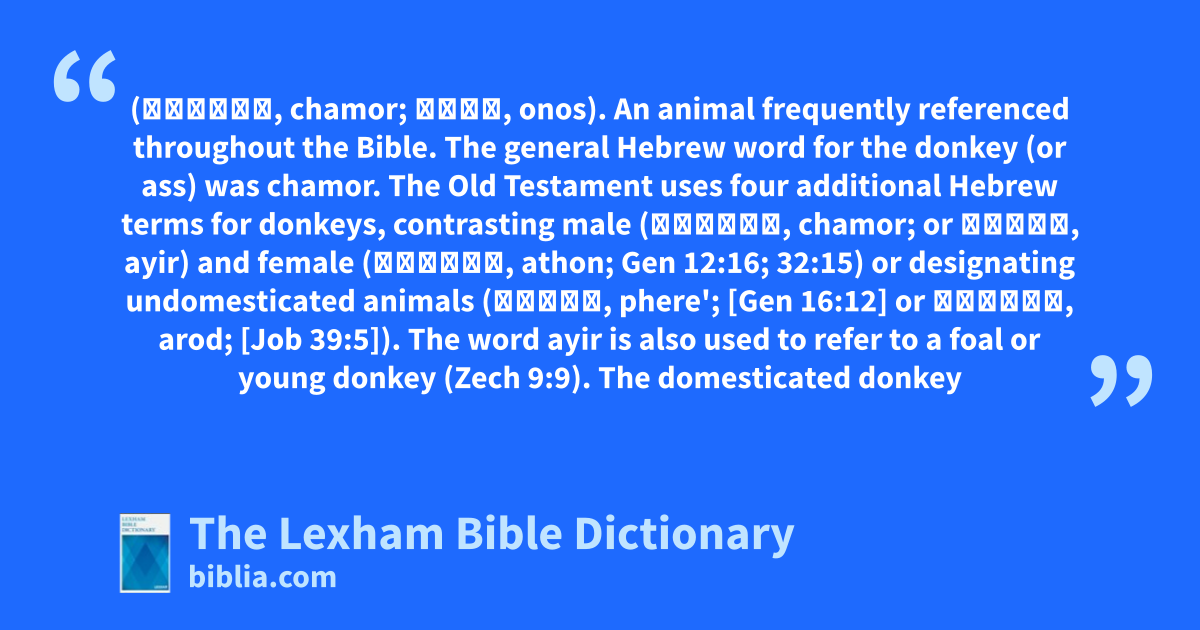 Donkey (חֲמוֹר, chamor; ὄνος, onos). An animal frequently referenced throughout the Bible. The general Hebrew word for the donkey (or ass) was chamor. The Old Testament uses four additional Hebrew terms for donkeys, contrasting male (חֲמוֹר, chamor; or עַיִר, ayir) and female (אָתוֹן, athon; Gen 12:16; 32:15) or designating undomesticated animals (פֶרֶא, phere'; [Gen 16:12] or עָרוֹד, arod; [Job 39:5]). The word ayir is also used to refer to a foal or young donkey (Zech 9:9). The domesticated donkey was used in the biblical world for riding (Num 22:21), for tilling (Isa 30:24), and for carrying burdens (Gen 45:23). Zechariah 9:9 describes the triumphal entry of the Messiah into Jerusalem on a donkey, and Matt 21:5 describes the fulfillment.