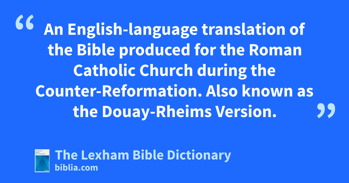 Douay Version An English-language translation of the Bible produced for the Roman Catholic Church during the Counter-Reformation. Also known as the Douay-Rheims Version.