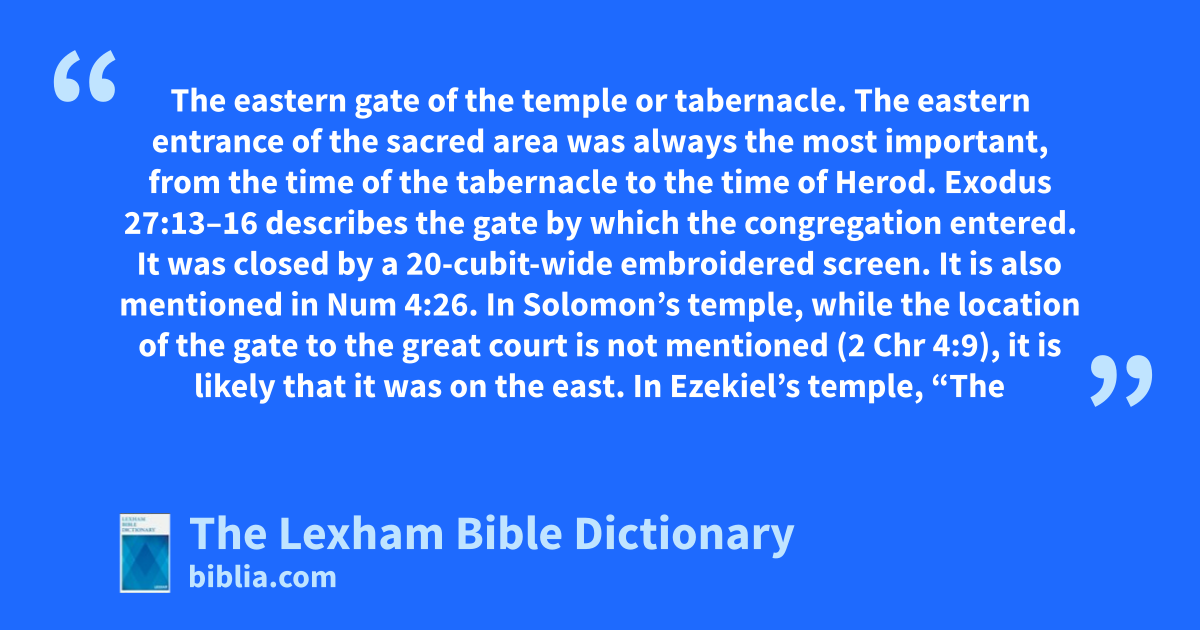 East Gate The eastern gate of the temple or tabernacle.