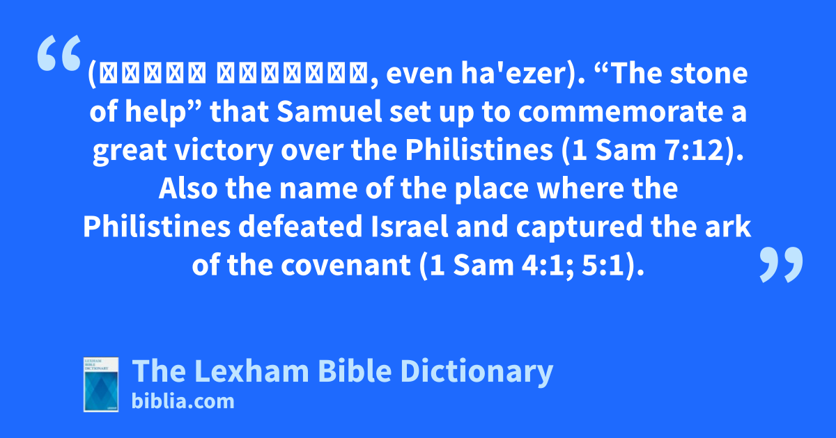 Ebenezer (אֶבֶן הָעֵזֶר, even ha'ezer). “The stone of help” that Samuel set up to commemorate a great victory over the Philistines (1 Sam 7:12). Also the name of the place where the Philistines defeated Israel and captured the ark of the covenant (1 Sam 4:1; 5:1).