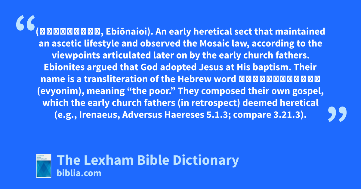 Ebionites (Ἐβιωναῖοι, Ebiōnaioi). An early heretical sect that maintained an ascetic lifestyle and observed the Mosaic law, according to the viewpoints articulated later on by the early church fathers. Ebionites argued that God adopted Jesus at His baptism. Their name is a transliteration of the Hebrew word אֶבְיוֹנִ֣ים (evyonim), meaning “the poor.” They composed their own gospel, which the early church fathers (in retrospect) deemed heretical (e.g., Irenaeus, Adversus Haereses 5.1.3; compare 3.21.3).