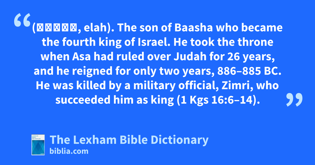 Elah, King of Israel (אֵלָה, elah). The son of Baasha who became the fourth king of Israel. He took the throne when Asa had ruled over Judah for 26 years, and he reigned for only two years, 886–885 bc. He was killed by a military official, Zimri, who succeeded him as king (1 Kgs 16:6–14).