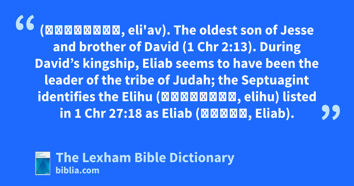 Eliab, Son of Jesse (אֱלִיאָב, eli'av). The oldest son of Jesse and brother of David (1 Chr 2:13). During David’s kingship, Eliab seems to have been the leader of the tribe of Judah; the Septuagint identifies the Elihu (אֱלִיהוּ, elihu) listed in 1 Chr 27:18 as Eliab (Ελιαβ, Eliab).
