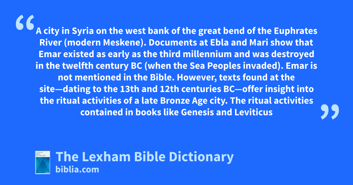 Emar A city in Syria on the west bank of the great bend of the Euphrates River (modern Meskene). Documents at Ebla and Mari show that Emar existed as early as the third millennium and was destroyed in the twelfth century bc (when the Sea Peoples invaded). Emar is not mentioned in the Bible. However, texts found at the site—dating to the 13th and 12th centuries bc—offer insight into the ritual activities of a late Bronze Age city. The ritual activities contained in books like Genesis and Leviticus are better understood when compared with other rituals of the same time period—like those found at Emar.