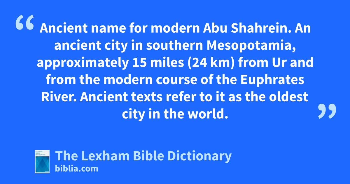 Eridu Ancient name for modern Abu Shahrein. An ancient city in southern Mesopotamia, approximately 15 miles (24 km) from Ur and from the modern course of the Euphrates River. Ancient texts refer to it as the oldest city in the world.
