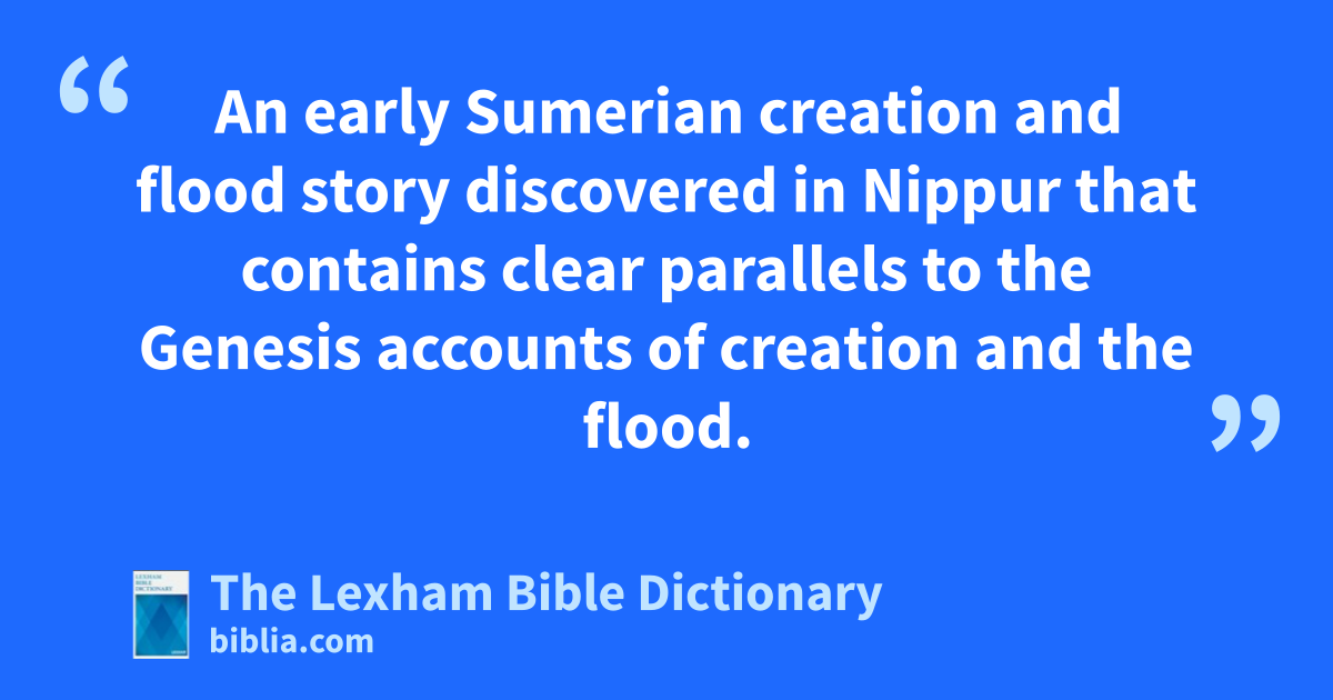Eridu Genesis An early Sumerian creation and flood story discovered in Nippur that contains clear parallels to the Genesis accounts of creation and the flood.