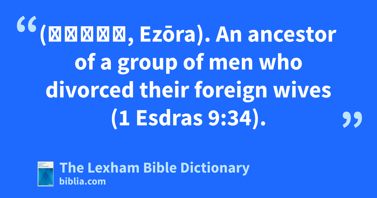 Ezora (Ἐζωρά, Ezōra). An ancestor of a group of men who divorced their foreign wives (1 Esdras 9:34).