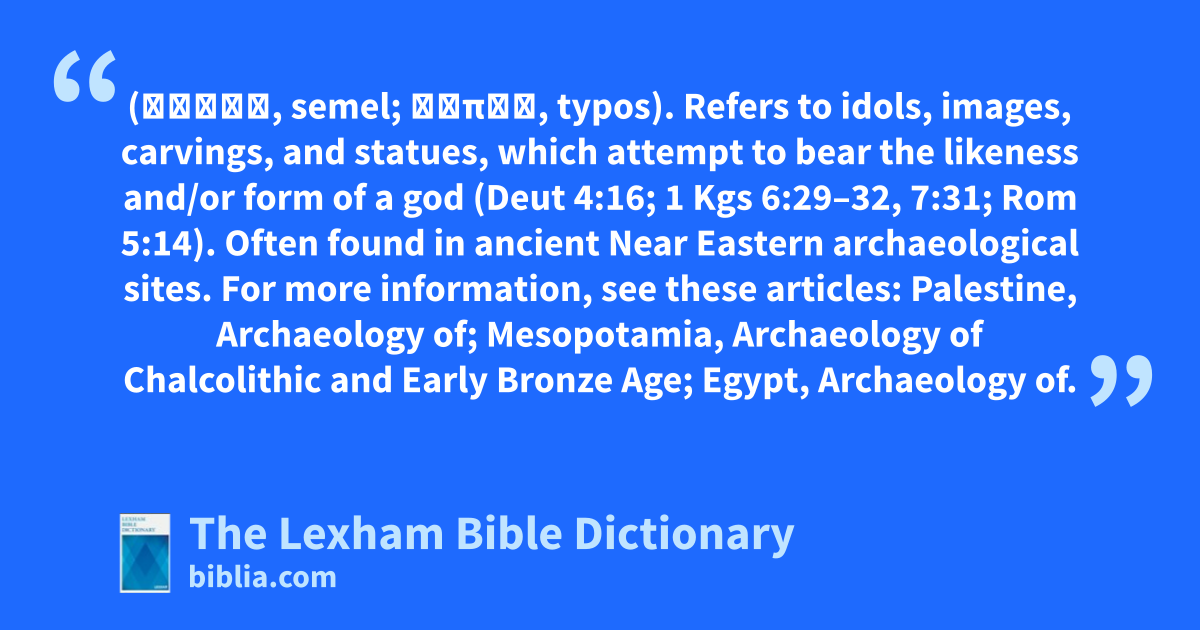 Figure (סֵמֶל, semel; τύπος, typos). Refers to idols, images, carvings, and statues, which attempt to bear the likeness and/or form of a god (Deut 4:16; 1 Kgs 6:29–32, 7:31; Rom 5:14). Often found in ancient Near Eastern archaeological sites. For more information, see these articles: Palestine, Archaeology of; Mesopotamia, Archaeology of Chalcolithic and Early Bronze Age; Egypt, Archaeology of.