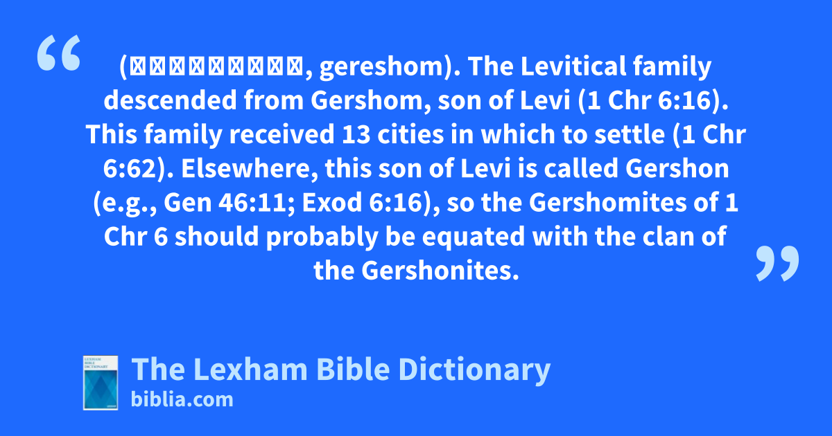 Gershomites (גֵּרְשֹׁם, gereshom). The Levitical family descended from Gershom, son of Levi (1 Chr 6:16). This family received 13 cities in which to settle (1 Chr 6:62). Elsewhere, this son of Levi is called Gershon (e.g., Gen 46:11; Exod 6:16), so the Gershomites of 1 Chr 6 should probably be equated with the clan of the Gershonites.
