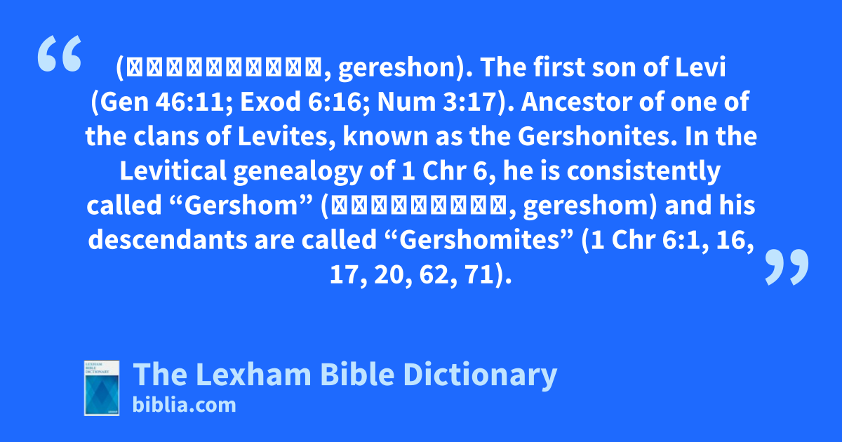 Gershon, Son of Levi (גֵּרְשׁוֹן, gereshon). The first son of Levi (Gen 46:11; Exod 6:16; Num 3:17). Ancestor of one of the clans of Levites, known as the Gershonites.