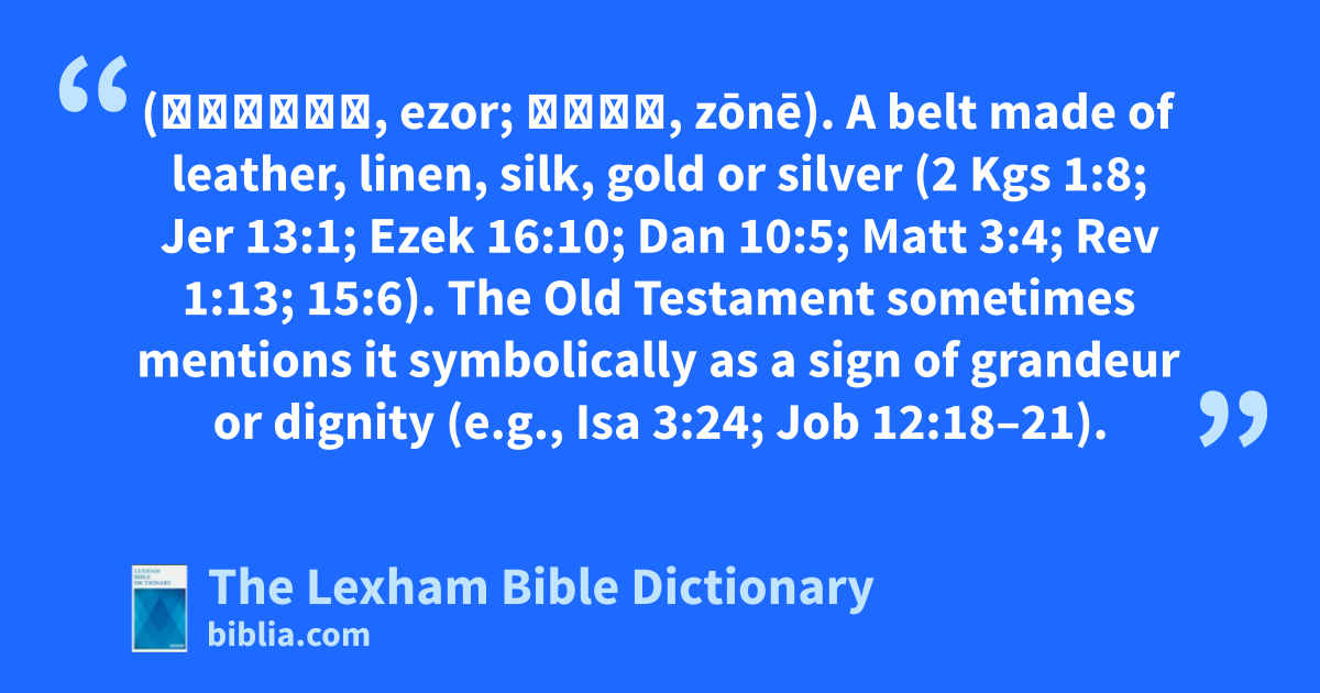 Girdle (אֵזוֹר, ezor; ζώνη, zōnē). A belt made of leather, linen, silk, gold or silver (2 Kgs 1:8; Jer 13:1; Ezek 16:10; Dan 10:5; Matt 3:4; Rev 1:13; 15:6). The Old Testament sometimes mentions it symbolically as a sign of grandeur or dignity (e.g., Isa 3:24; Job 12:18–21).