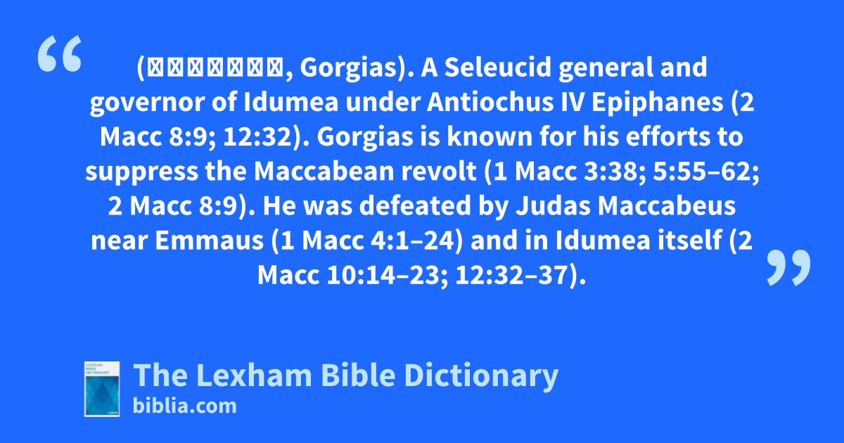 Gorgias (Γοργίας, Gorgias). A Seleucid general and governor of Idumea under Antiochus IV Epiphanes (2 Macc 8:9; 12:32). Gorgias is known for his efforts to suppress the Maccabean revolt (1 Macc 3:38; 5:55–62; 2 Macc 8:9). He was defeated by Judas Maccabeus near Emmaus (1 Macc 4:1–24) and in Idumea itself (2 Macc 10:14–23; 12:32–37).