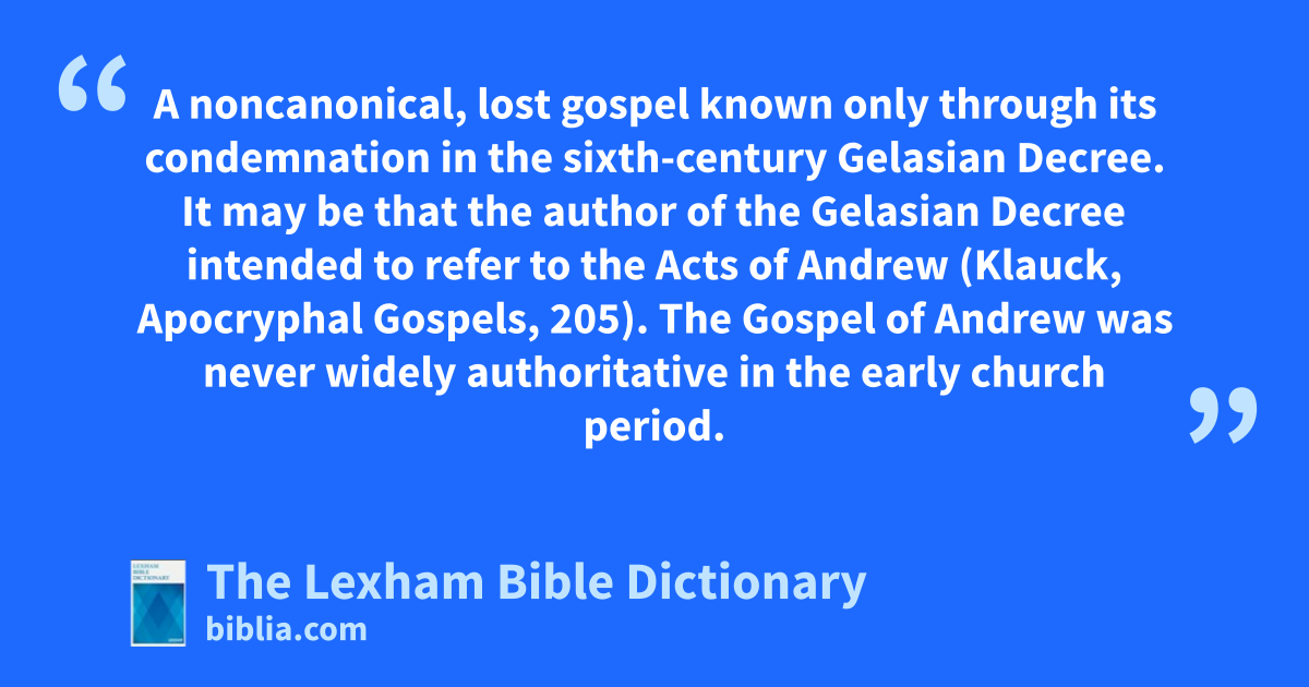Gospel of Andrew A noncanonical, lost gospel known only through its condemnation in the sixth-century Gelasian Decree. It may be that the author of the Gelasian Decree intended to refer to the Acts of Andrew (Klauck, Apocryphal Gospels, 205). The Gospel of Andrew was never widely authoritative in the early church period.