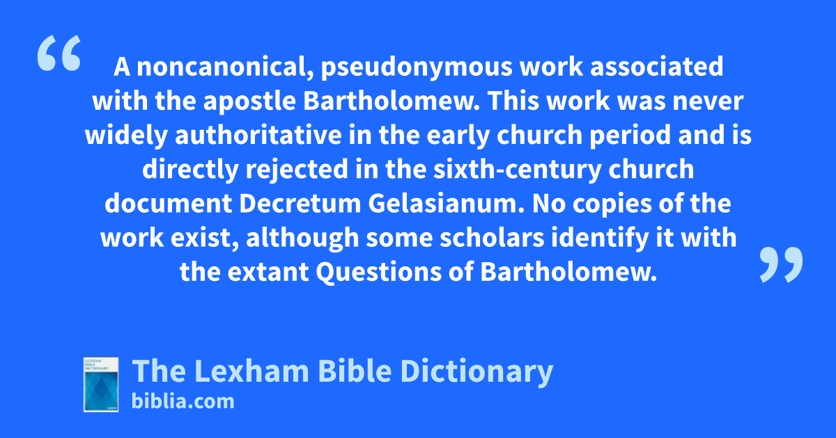 Gospel of Bartholomew A noncanonical, pseudonymous work associated with the apostle Bartholomew. This work was never widely authoritative in the early church period and is directly rejected in the sixth-century church document Decretum Gelasianum. No copies of the work exist, although some scholars identify it with the extant Questions of Bartholomew.