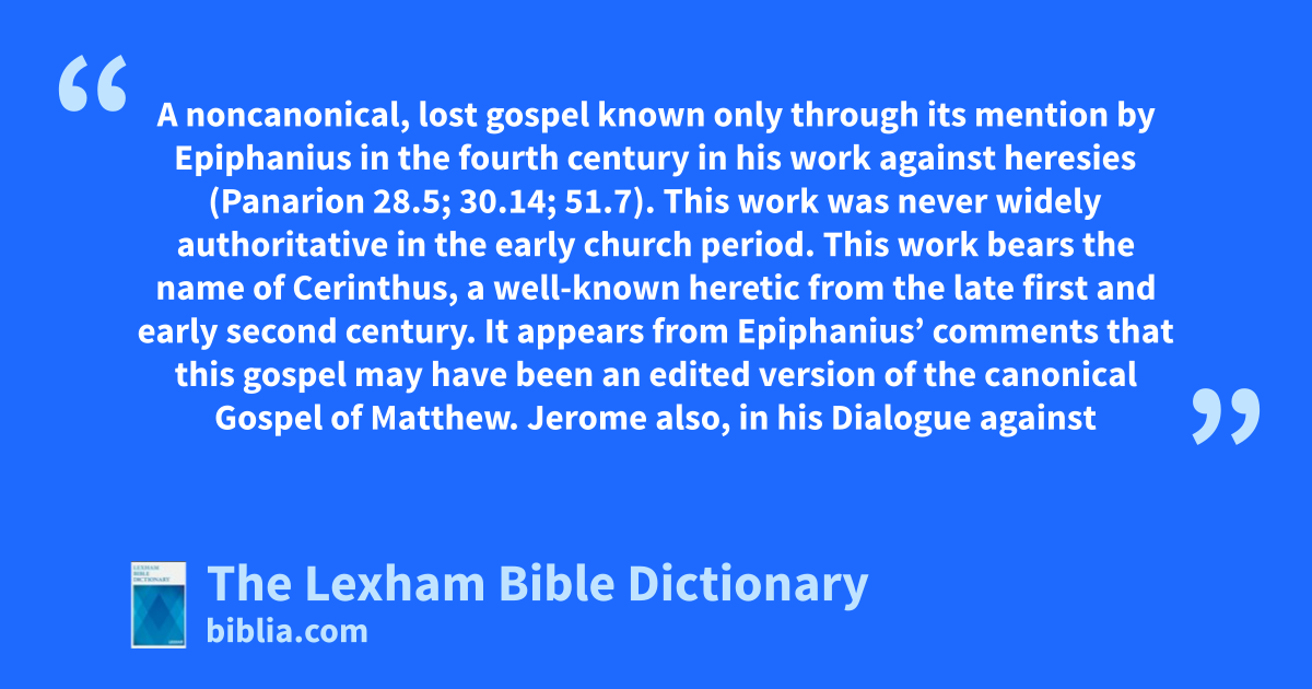 This work bears the name of Cerinthus, a well-known heretic from the late first and early second century. It appears from Epiphanius’ comments that this gospel may have been an edited version of the canonical Gospel of Matthew. Jerome also, in his Dialogue against the Luciferians 23, lists Cerinthus among those who “have mangled the Gospels.”