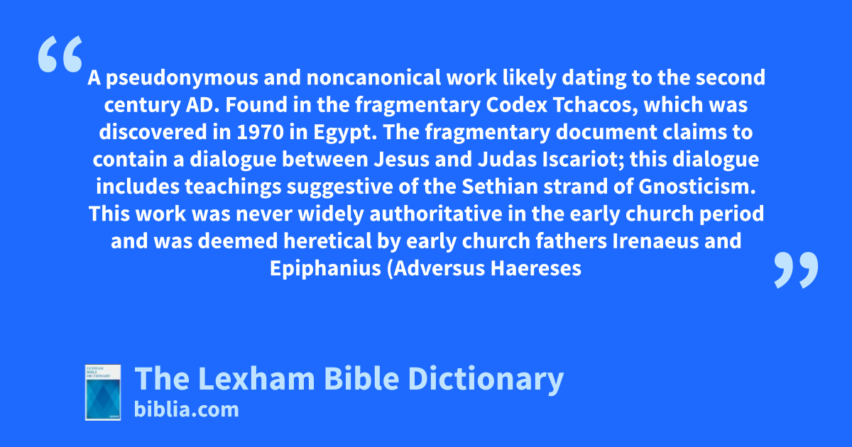 Gospel of Judas A pseudonymous and noncanonical work likely dating to the second century ad. Found in the fragmentary Codex Tchacos, which was discovered in 1970 in Egypt. The fragmentary document claims to contain a dialogue between Jesus and Judas Iscariot; this dialogue includes teachings suggestive of the Sethian strand of Gnosticism. This work was never widely authoritative in the early church period and was deemed heretical by early church fathers Irenaeus and Epiphanius (Adversus Haereses 1.31.1; Panarion 38).