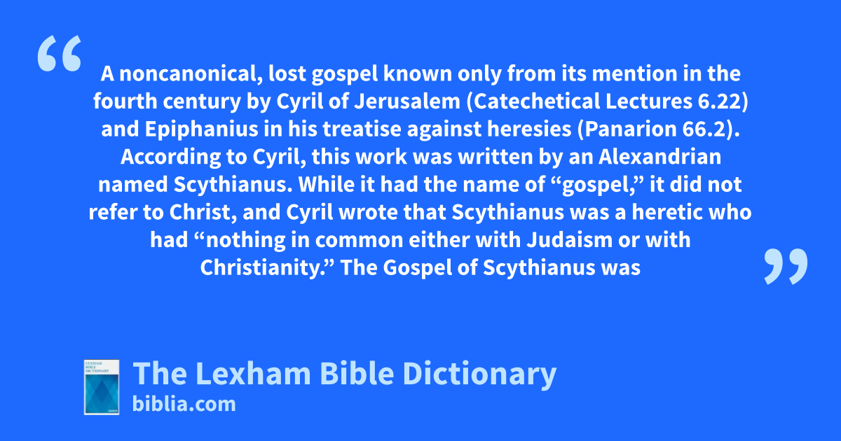 Gospel of Scythianus A noncanonical, lost gospel known only from its mention in the fourth century by Cyril of Jerusalem (Catechetical Lectures 6.22) and Epiphanius in his treatise against heresies (Panarion 66.2). According to Cyril, this work was written by an Alexandrian named Scythianus. While it had the name of “gospel,” it did not refer to Christ, and Cyril wrote that Scythianus was a heretic who had “nothing in common either with Judaism or with Christianity.” The Gospel of Scythianus was never widely authoritative in the early church period.