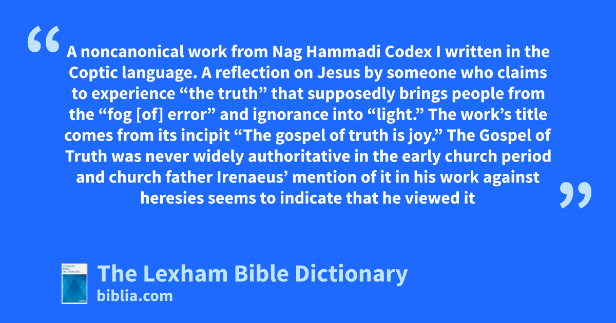 Gospel of Truth A noncanonical work from Nag Hammadi Codex I written in the Coptic language. A reflection on Jesus by someone who claims to experience “the truth” that supposedly brings people from the “fog [of] error” and ignorance into “light.” The work’s title comes from its incipit “The gospel of truth is joy.” The Gospel of Truth was never widely authoritative in the early church period and church father Irenaeus’ mention of it in his work against heresies seems to indicate that he viewed it as heretical (see Adversus Haereses 3.11.9).