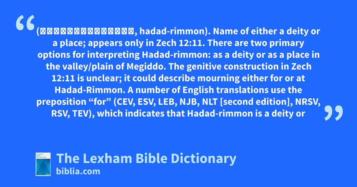 There are two primary options for interpreting Hadad-rimmon: as a deity or as a place in the valley/plain of Megiddo. The genitive construction in Zech 12:11 is unclear; it could describe mourning either for or at Hadad-Rimmon. A number of English translations use the preposition “for” (CEV, ESV, LEB, NJB, NLT [second edition], NRSV, RSV, TEV), which indicates that Hadad-rimmon is a deity or person being mourned. Other translations use “at” (NET, NKJV), referring to Hadad-rimmon as the place of mourning. Other versions use “of” (CEB, KJV, NAB, NASB, NIV [1984, 2011], NLT [first edition]), which leaves the meaning ambiguous.