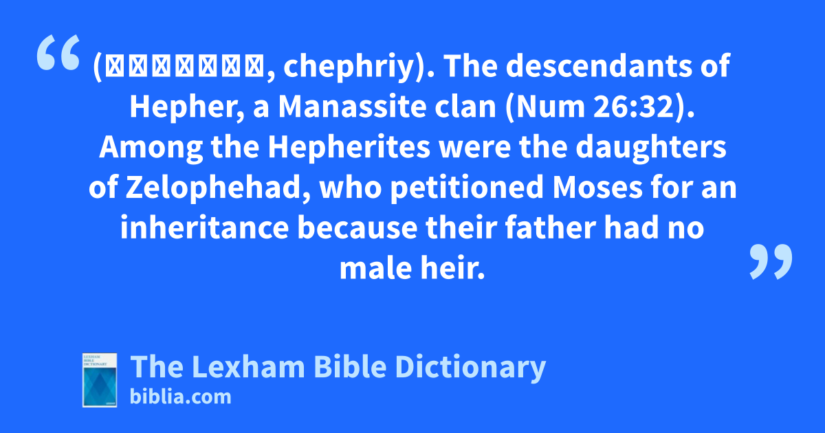 Hepherites (חֶפְרִי, chephriy). The descendants of Hepher, a Manassite clan (Num 26:32). Among the Hepherites were the daughters of Zelophehad, who petitioned Moses for an inheritance because their father had no male heir.