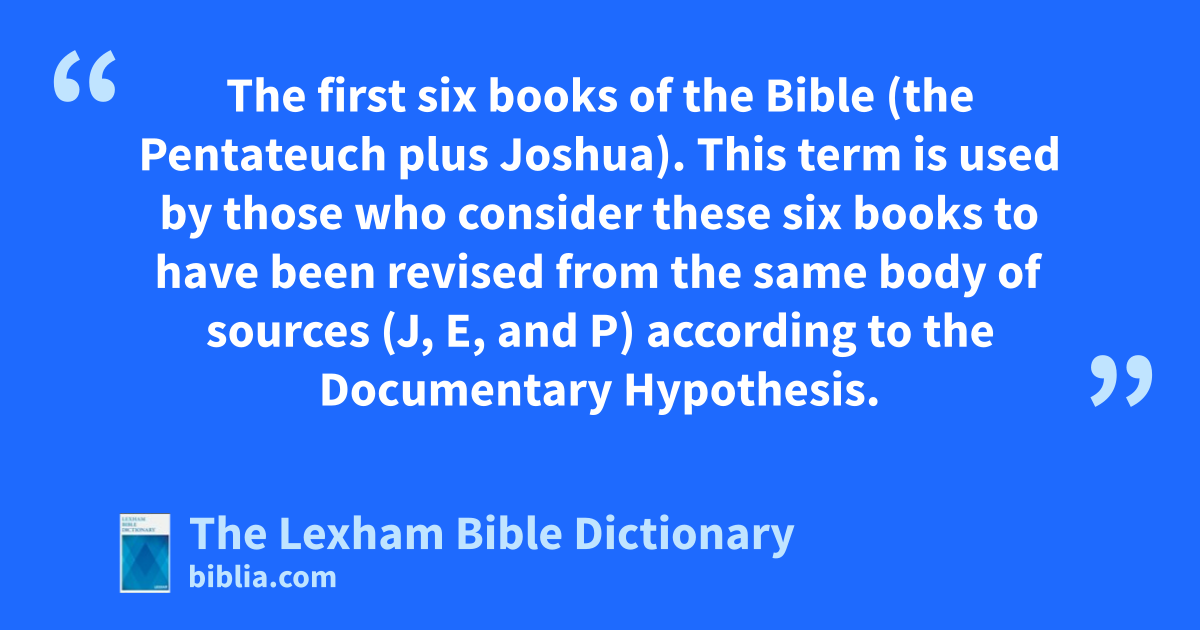 Hexateuch The first six books of the Bible (the Pentateuch plus Joshua). This term is used by those who consider these six books to have been revised from the same body of sources (J, E, and P) according to the Documentary Hypothesis.