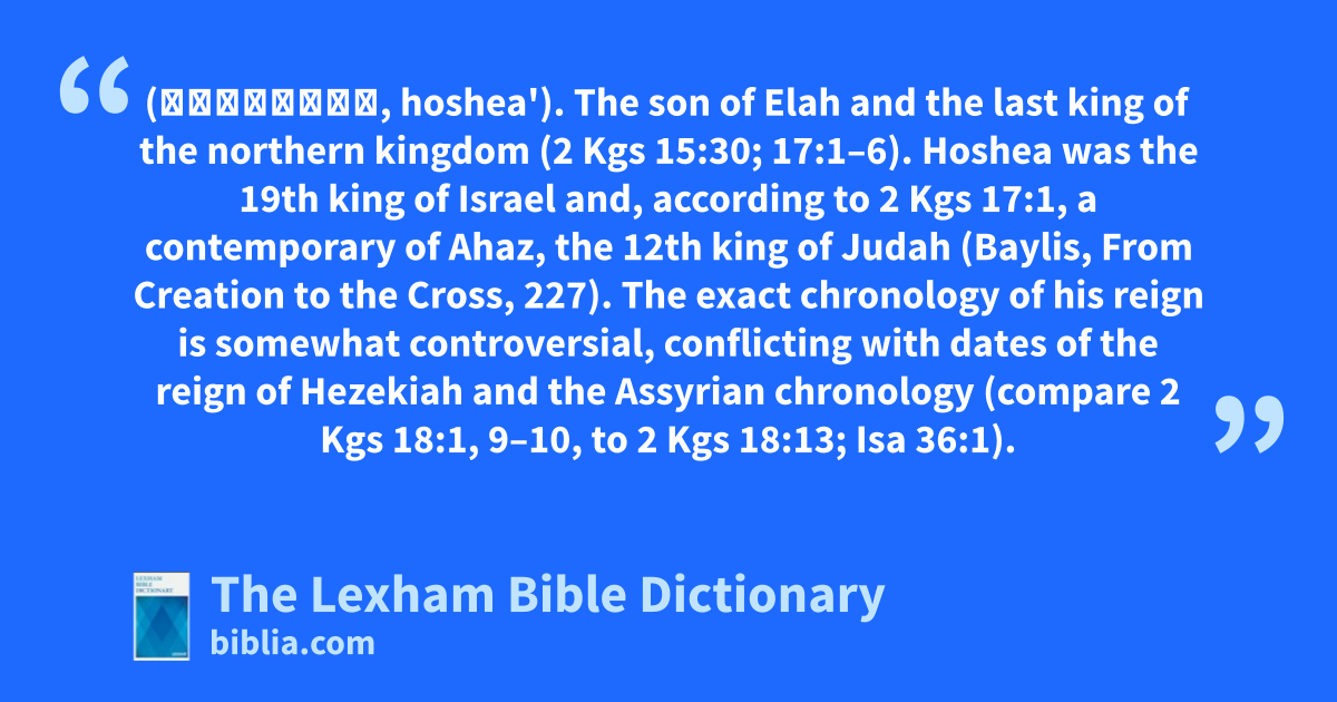 Hoshea was the 19th king of Israel and, according to 2 Kgs 17:1, a contemporary of Ahaz, the 12th king of Judah (Baylis, From Creation to the Cross, 227). The exact chronology of his reign is somewhat controversial, conflicting with dates of the reign of Hezekiah and the Assyrian chronology (compare 2 Kgs 18:1, 9–10, to 2 Kgs 18:13; Isa 36:1).