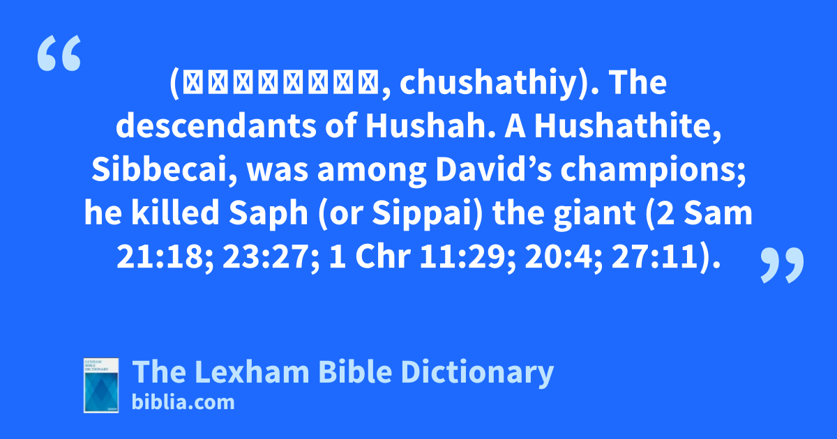 Hushathites (חֻשָׁתִי, chushathiy). The descendants of Hushah. A Hushathite, Sibbecai, was among David’s champions; he killed Saph (or Sippai) the giant (2 Sam 21:18; 23:27; 1 Chr 11:29; 20:4; 27:11).