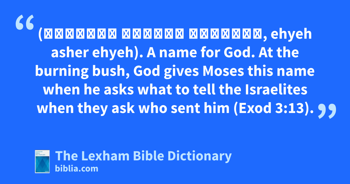 I Am Who I Am (אֶהְיֶה אֲשֶׁר אֶהְיֶה, ehyeh asher ehyeh). A name for God. At the burning bush, God gives Moses this name when he asks what to tell the Israelites when they ask who sent him (Exod 3:13).
