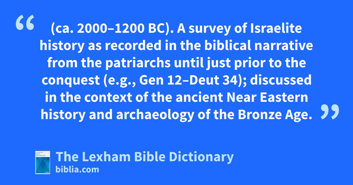 Israel, History of, Before the Conquest (ca. 2000–1200 bc). A survey of Israelite history as recorded in the biblical narrative from the patriarchs until just prior to the conquest (e.g., Gen 12–Deut 34); discussed in the context of the ancient Near Eastern history and archaeology of the Bronze Age.