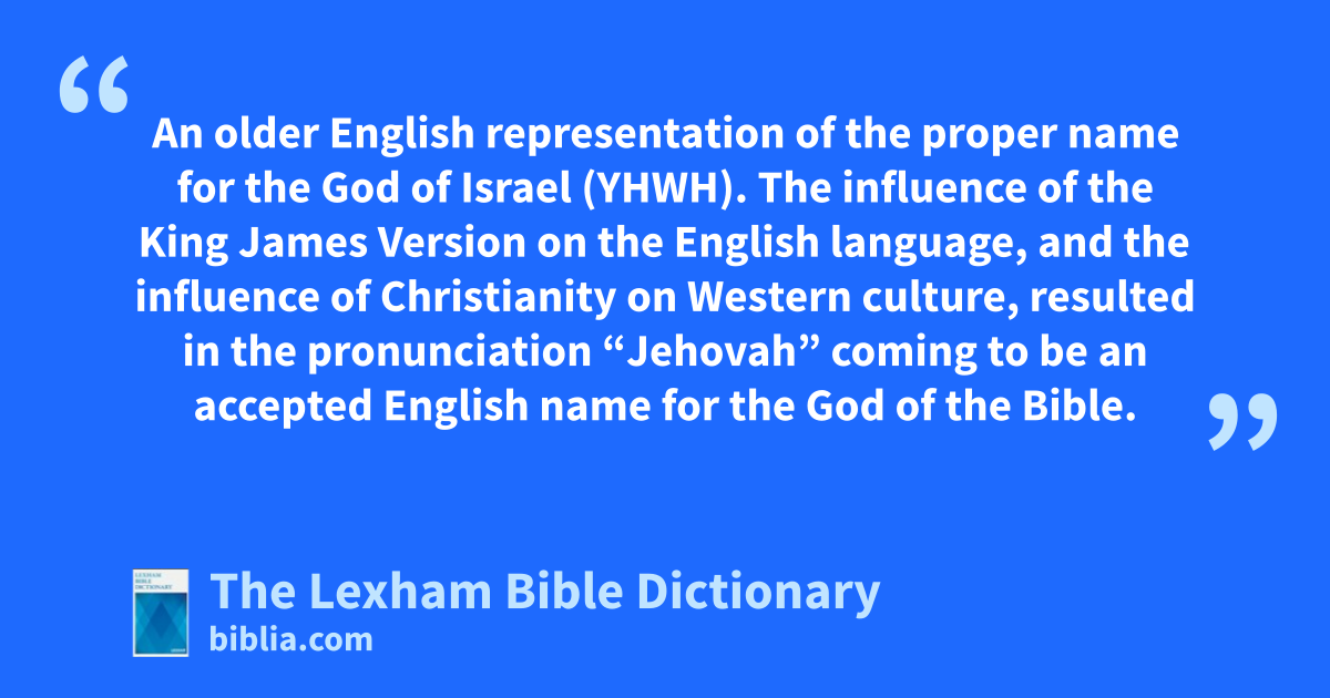 Jehovah An older English representation of the proper name for the God of Israel (YHWH). The influence of the King James Version on the English language, and the influence of Christianity on Western culture, resulted in the pronunciation “Jehovah” coming to be an accepted English name for the God of the Bible.