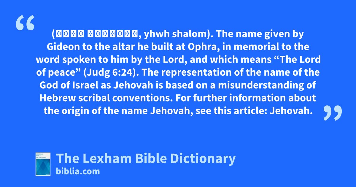 Jehovah-Shalom (יהוה שָׁלוֹם, yhwh shalom). The name given by Gideon to the altar he built at Ophra, in memorial to the word spoken to him by the Lord, and which means “The Lord of peace” (Judg 6:24). The representation of the name of the God of Israel as Jehovah is based on a misunderstanding of Hebrew scribal conventions. For further information about the origin of the name Jehovah, see this article: Jehovah.