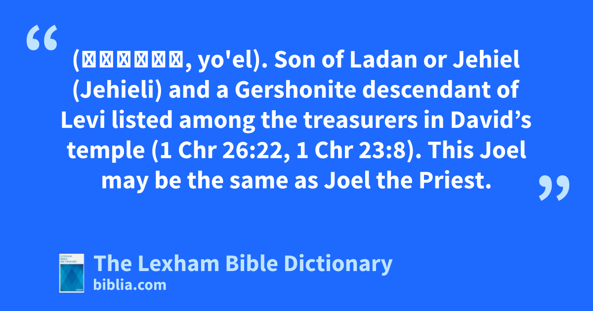 Joel, Son of Jehiel (יוֹאֵל, yo'el). Son of Ladan or Jehiel (Jehieli) and a Gershonite descendant of Levi listed among the treasurers in David’s temple (1 Chr 26:22, 1 Chr 23:8). This Joel may be the same as Joel the Priest.