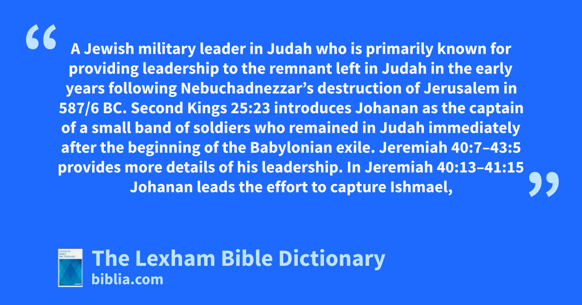 Second Kings 25:23 introduces Johanan as the captain of a small band of soldiers who remained in Judah immediately after the beginning of the Babylonian exile. Jeremiah 40:7–43:5 provides more details of his leadership.