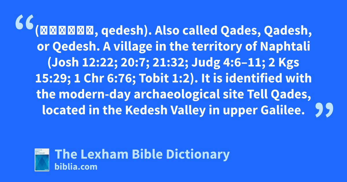 Kedesh in Naphtali (קֶדֶשׁ, qedesh). Also called Qades, Qadesh, or Qedesh. A village in the territory of Naphtali (Josh 12:22; 20:7; 21:32; Judg 4:6–11; 2 Kgs 15:29; 1 Chr 6:76; Tobit 1:2). It is identified with the modern-day archaeological site Tell Qades, located in the Kedesh Valley in upper Galilee.