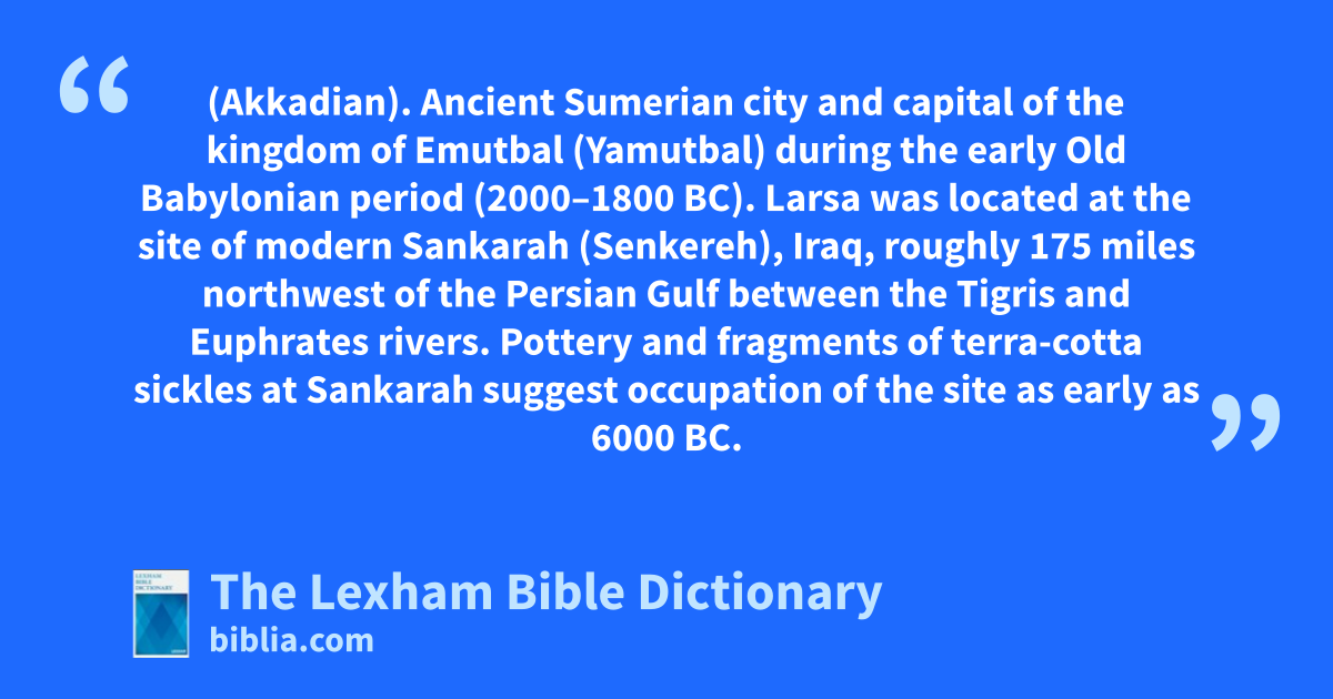 Larsa (Akkadian). Ancient Sumerian city and capital of the kingdom of Emutbal (Yamutbal) during the early Old Babylonian period (2000–1800 bc). Larsa was located at the site of modern Sankarah (Senkereh), Iraq, roughly 175 miles northwest of the Persian Gulf between the Tigris and Euphrates rivers. Pottery and fragments of terra-cotta sickles at Sankarah suggest occupation of the site as early as 6000 bc.