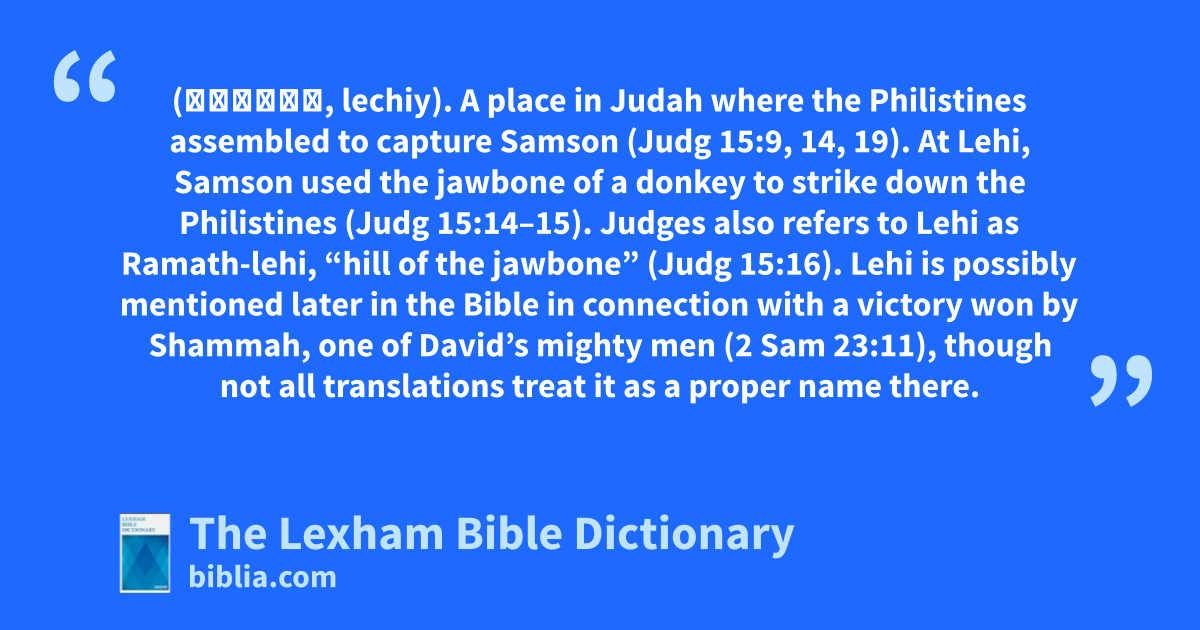 At Lehi, Samson used the jawbone of a donkey to strike down the Philistines (Judg 15:14–15). Judges also refers to Lehi as Ramath-lehi, “hill of the jawbone” (Judg 15:16). Lehi is possibly mentioned later in the Bible in connection with a victory won by Shammah, one of David’s mighty men (2 Sam 23:11), though not all translations treat it as a proper name there.
