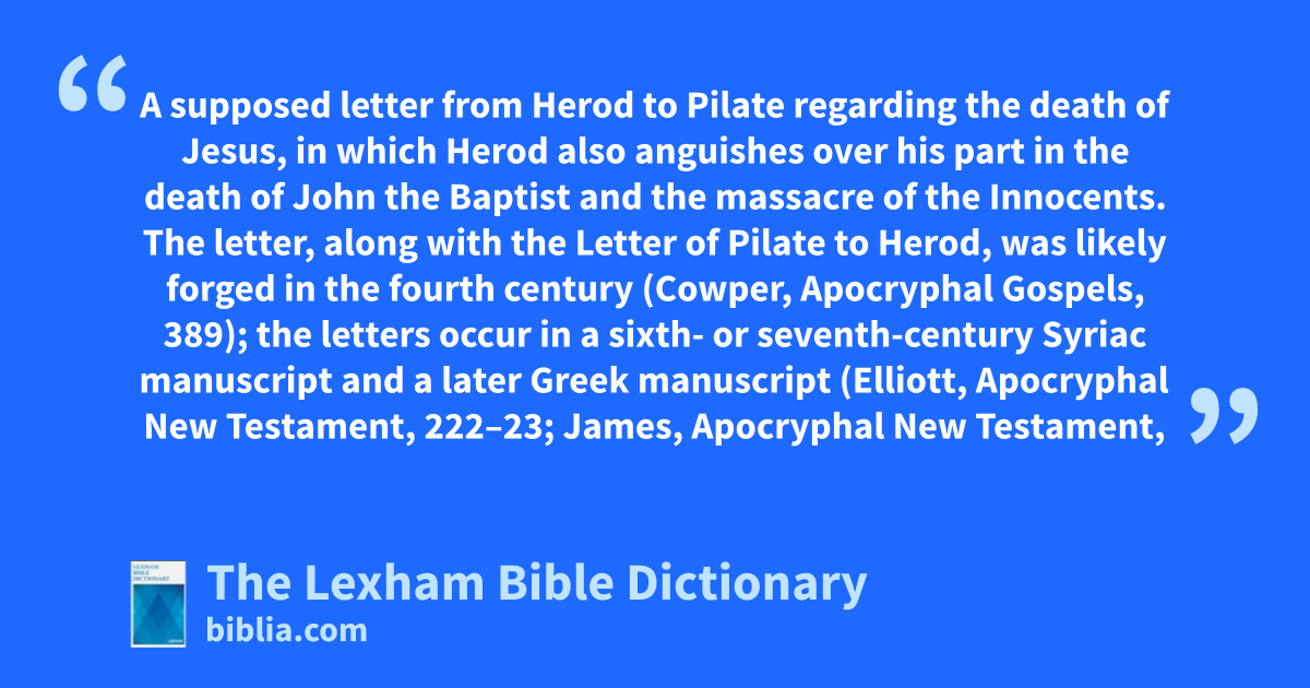 Letter of Herod to Pilate A supposed letter from Herod to Pilate regarding the death of Jesus, in which Herod also anguishes over his part in the death of John the Baptist and the massacre of the Innocents. The letter, along with the Letter of Pilate to Herod, was likely forged in the fourth century (Cowper, Apocryphal Gospels, 389); the letters occur in a sixth- or seventh-century Syriac manuscript and a later Greek manuscript (Elliott, Apocryphal New Testament, 222–23; James, Apocryphal New Testament, 155). This material was never widely authoritative in the early church period and is part of a group of noncanonical texts known as the Pilate Cycle.