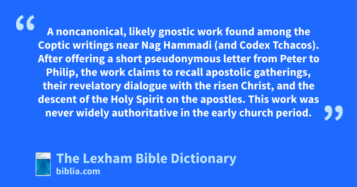 Letter of Peter to Philip A noncanonical, likely gnostic work found among the Coptic writings near Nag Hammadi (and Codex Tchacos). After offering a short pseudonymous letter from Peter to Philip, the work claims to recall apostolic gatherings, their revelatory dialogue with the risen Christ, and the descent of the Holy Spirit on the apostles. This work was never widely authoritative in the early church period.