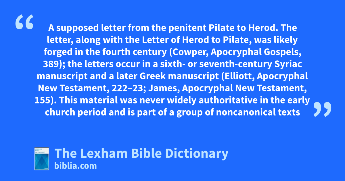 Letter of Pilate to Herod A supposed letter from the penitent Pilate to Herod. The letter, along with the Letter of Herod to Pilate, was likely forged in the fourth century (Cowper, Apocryphal Gospels, 389); the letters occur in a sixth- or seventh-century Syriac manuscript and a later Greek manuscript (Elliott, Apocryphal New Testament, 222–23; James, Apocryphal New Testament, 155). This material was never widely authoritative in the early church period and is part of a group of noncanonical texts known as the Pilate Cycle.