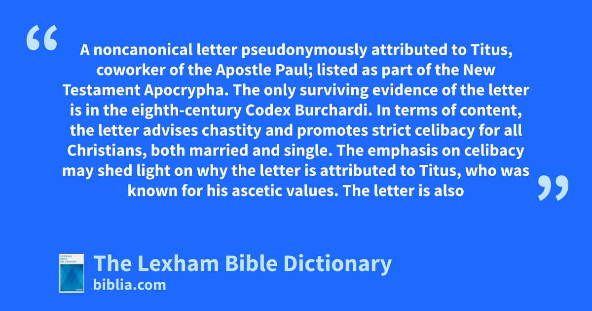 Letter of Pseudo-Titus A noncanonical letter pseudonymously attributed to Titus, coworker of the Apostle Paul; listed as part of the New Testament Apocrypha. The only surviving evidence of the letter is in the eighth-century Codex Burchardi. In terms of content, the letter advises chastity and promotes strict celibacy for all Christians, both married and single. The emphasis on celibacy may shed light on why the letter is attributed to Titus, who was known for his ascetic values. The letter is also full of scriptural citations that are used to support its teaching on celibacy. This work was never widely authoritative in the early church period, nor could it have been based on its late date.