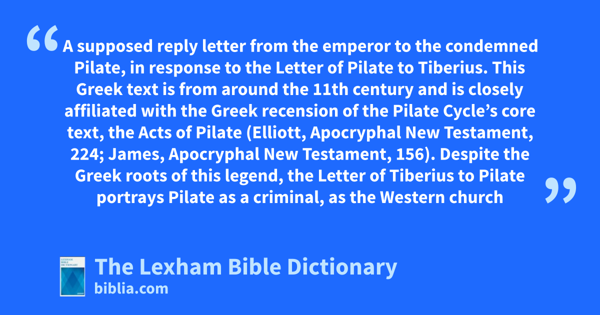 Letter of Tiberius to Pilate A supposed reply letter from the emperor to the condemned Pilate, in response to the Letter of Pilate to Tiberius. This Greek text is from around the 11th century and is closely affiliated with the Greek recension of the Pilate Cycle’s core text, the Acts of Pilate (Elliott, Apocryphal New Testament, 224; James, Apocryphal New Testament, 156). Despite the Greek roots of this legend, the Letter of Tiberius to Pilate portrays Pilate as a criminal, as the Western church tradition has traditionally done and as some of the other texts in the Pilate Cycle do (Avenging of the Savior; Death of Pilate). In this letter, Pilate is killed in prison by the hunting arrow of the emperor. This noncanonical letter was never widely authoritative for the early church, nor could it have been based on its late date.