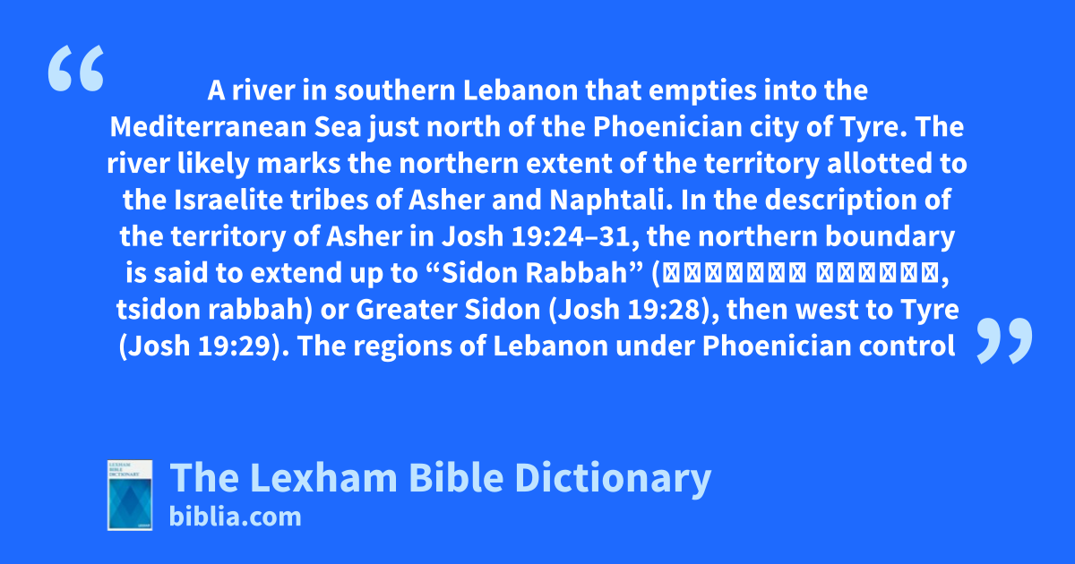 Litani A river in southern Lebanon that empties into the Mediterranean Sea just north of the Phoenician city of Tyre. The river likely marks the northern extent of the territory allotted to the Israelite tribes of Asher and Naphtali. In the description of the territory of Asher in Josh 19:24–31, the northern boundary is said to extend up to “Sidon Rabbah” (צִידוֹן רַבָּה, tsidon rabbah) or Greater Sidon (Josh 19:28), then west to Tyre (Josh 19:29). The regions of Lebanon under Phoenician control are part of the territory of Canaan left unconquered by Israel in the list found in Josh 13:1–6 (compare Judg 1:31). Joshua 11:8 suggests the area of Greater Sidon around Misrephoth-Maim (מִשְׂרְפוֹת מַיִם, misrephoth mayim) marks Israel’s northern frontier. Since the deep gorge of the Litani would have formed a natural boundary, it may be that the river is meant by Misrephoth-Maim, the location mentioned twice in connection with the border with Sidon (Josh 11:8; 13:6). The second part of the name, mayim, means “water.”