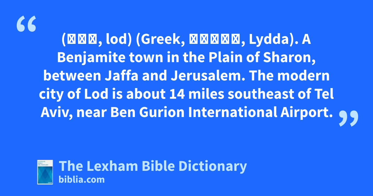 Lod (לֹד, lod) (Greek, Λύδδα, Lydda). A Benjamite town in the Plain of Sharon, between Jaffa and Jerusalem. The modern city of Lod is about 14 miles southeast of Tel Aviv, near Ben Gurion International Airport.