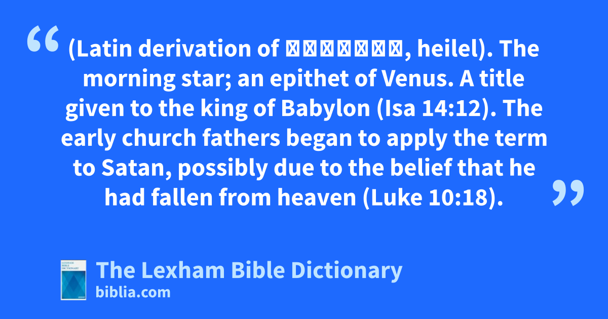 Lucifer (Latin derivation of הֵילֵ֣ל, heilel). The morning star; an epithet of Venus. A title given to the king of Babylon (Isa 14:12). The early church fathers began to apply the term to Satan, possibly due to the belief that he had fallen from heaven (Luke 10:18).
